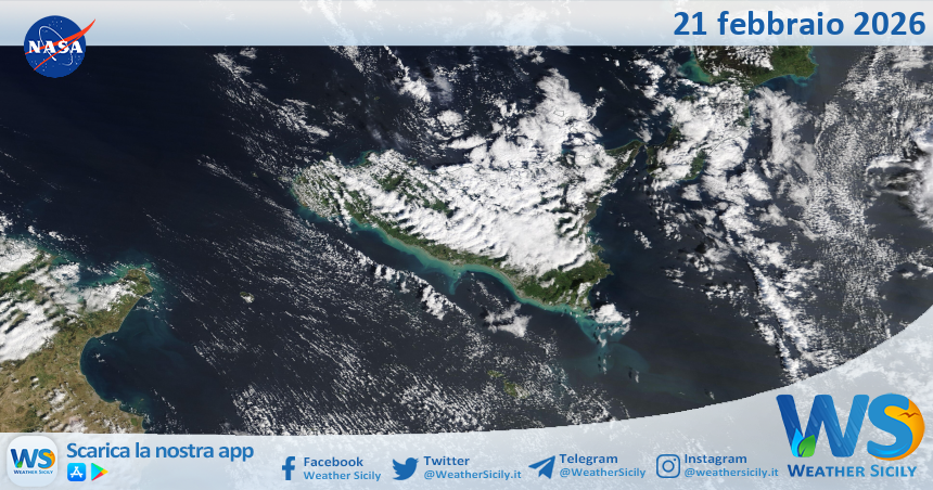 IMMAGINI NASA Meteo Sicilia: immagine satellitare Nasa di sabato 21 febbraio 2026 Di Redazione - 21 Febbraio 2026 0 0 FacebookTelegramWhatsApp Salve amici di weathersicily.it. Come di consueto vi mostriamo l’immagine satellitare odierna della Nasa, di sabato 21 febbraio 2026, la quale ritrae la nostra isola.