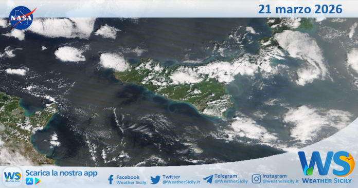 IMMAGINI NASA Meteo Sicilia: immagine satellitare Nasa di sabato 21 marzo 2026 Di Redazione - 21 Marzo 2026 0 31 FacebookTelegramTwitterWhatsAppCopy URL Tempo di lettura: < 1 minutiSalve amici di weathersicily.it. Come di consueto vi mostriamo l’immagine satellitare odierna della Nasa, di sabato 21 marzo 2026, la quale ritrae la nostra isola.