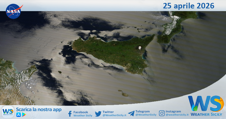 IMMAGINI NASA Meteo Sicilia: immagine satellitare Nasa di sabato 25 aprile 2026 Di Redazione - 25 Aprile 2026 0 0 FacebookTelegramTwitterWhatsAppCopy URL Tempo di lettura: < 1 minutiSalve amici di weathersicily.it. Come di consueto vi mostriamo l’immagine satellitare odierna della Nasa, di sabato 25 aprile 2026, la quale ritrae la nostra isola.