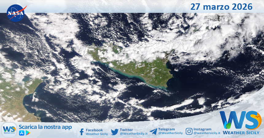 IMMAGINI NASA Meteo Sicilia: immagine satellitare Nasa di venerdì 27 marzo 2026 Di Redazione - 27 Marzo 2026 0 0 FacebookTelegramTwitterWhatsAppCopy URL Tempo di lettura: < 1 minutiSalve amici di weathersicily.it. Come di consueto vi mostriamo l’immagine satellitare odierna della Nasa, di venerdì 27 marzo 2026, la quale ritrae la nostra isola.