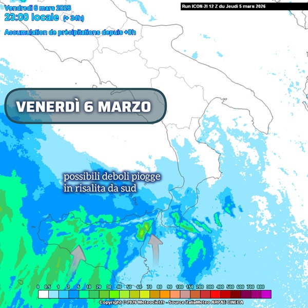 Ampia nuvolosità in risalita già tra la notte-mattina dallo Stretto di Sicilia, con possibilità di qualche debole pioggia in arrivo sui settori centro–meridionali e occidentali, “sporcata” dalla polvere desertica in sospensione. Possibile qualche fenomeno sugli altri settori, con eventuali piogge più diffuse tra alto catanese ed etneo. In generale comunque non sono attese precipitazioni di particolari rilievo, con accumuli modesti.
