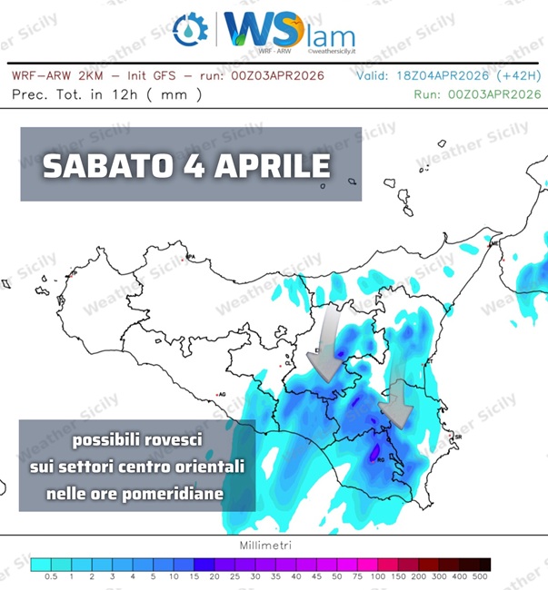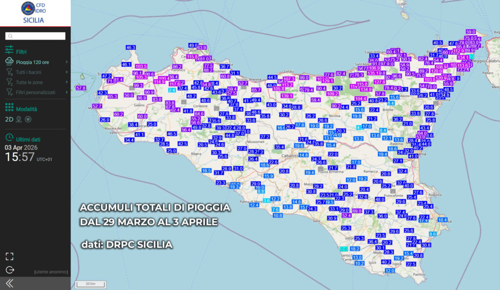 L’inizio di aprile sull’Italia è stato dominato dall’azione del ciclone Erminio, che con il suo centro di bassa pressione piazzato nei giorni scorsi sulla Sicilia ha imperversato sulle regioni peninsulari del centro sud, colpite duramente dal forte maltempo. Proprio il posizionamento del minimo a ridosso della Sicilia ha risparmiato la nostra isola dagli effetti più intensi di questa fase perturbata, che tuttavia è risultata comunque notevole. In particolare, dopo lo spostamento della depressione sullo Ionio da giovedì i versanti tirrenici e settentrionali sono stati interessati da precipitazioni abbondanti: lo si nota nella mappa in basso che riporta le cumulate di pioggia totali dell’intera fase perturbata, ben distribuite su tutta la regione ma soprattutto tra messinese, palermitano e trapanese.