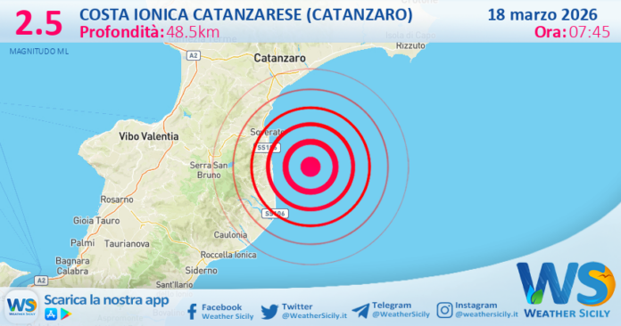 Salve amici di weathersicily.it. Quest’oggi mercoledì 18 marzo 2026 alle ore 07:45 è stata registrata, dalle stazioni sismiche dell’Istituto Nazionale di Geofisica e Vulcanologia, una scossa di magnitudo 2.5 ad una profondita di 48.5 km.