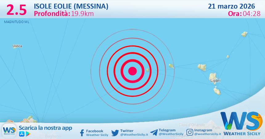 Salve amici di weathersicily.it. Quest’oggi sabato 21 marzo 2026 alle ore 04:28 è stata registrata, dalle stazioni sismiche dell’Istituto Nazionale di Geofisica e Vulcanologia, una scossa di magnitudo 2.5 ad una profondita di 19.9 km.