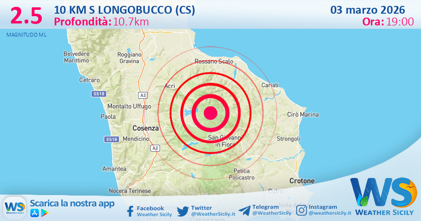 Salve amici di weathersicily.it. Quest’oggi martedì 03 marzo 2026 alle ore 19:00 è stata registrata, dalle stazioni sismiche dell’Istituto Nazionale di Geofisica e Vulcanologia, una scossa di magnitudo 2.5 ad una profondita di 10.7 km.