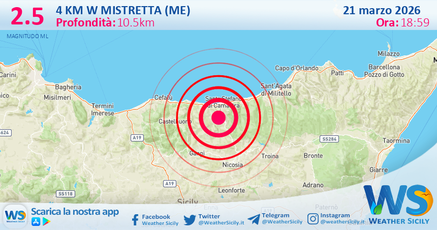 Salve amici di weathersicily.it. Quest’oggi sabato 21 marzo 2026 alle ore 18:59 è stata registrata, dalle stazioni sismiche dell’Istituto Nazionale di Geofisica e Vulcanologia, una scossa di magnitudo 2.5 ad una profondita di 10.5 km.