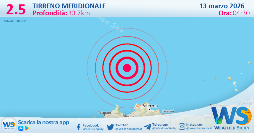Salve amici di weathersicily.it. Quest’oggi venerdì 13 marzo 2026 alle ore 04:30 è stata registrata, dalle stazioni sismiche dell’Istituto Nazionale di Geofisica e Vulcanologia, una scossa di magnitudo 2.5 ad una profondita di 30.7 km.