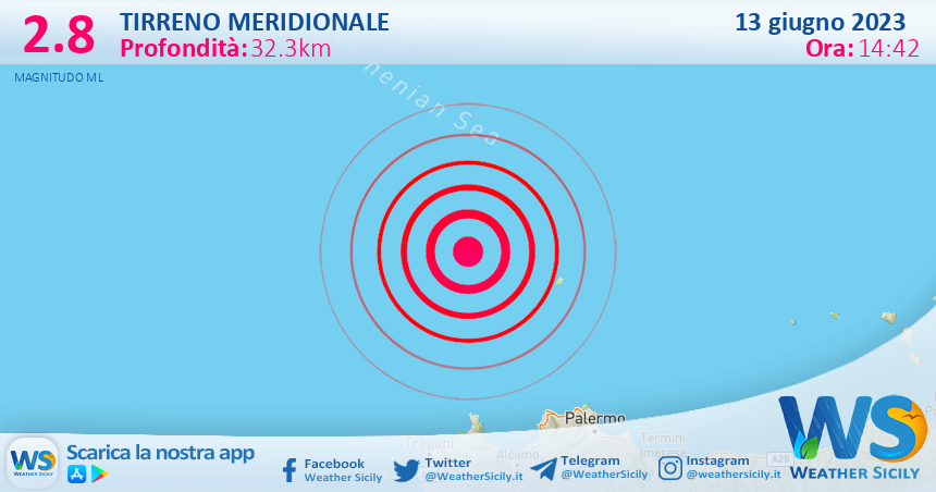 Salve amici di weathersicily.it. Quest’oggi martedì 13 giugno 2023 alle ore 14:42 è stata registrata, dalle stazioni sismiche dell’Istituto Nazionale di Geofisica e Vulcanologia, una scossa di magnitudo 2.8 ad una profondita di 32.3 km.