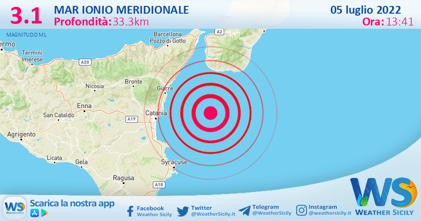 Salve amici di weathersicily.it. Quest’oggi martedì 05 luglio 2022 alle ore 13:41 è stata registrata, dalle stazioni sismiche dell’Istituto Nazionale di Geofisica e Vulcanologia, una scossa di magnitudo 3.1 ad una profondita di 33.3 km.