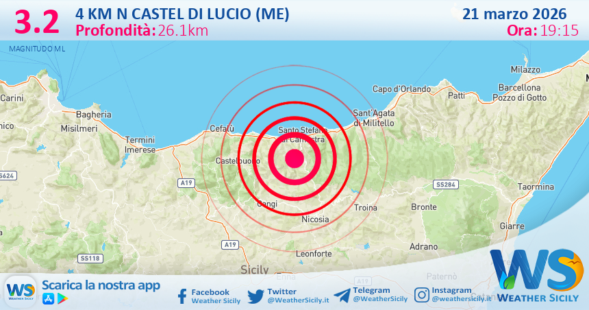 Salve amici di weathersicily.it. Quest’oggi sabato 21 marzo 2026 alle ore 19:15 è stata registrata, dalle stazioni sismiche dell’Istituto Nazionale di Geofisica e Vulcanologia, una scossa di magnitudo 3.2 ad una profondita di 26.1 km.