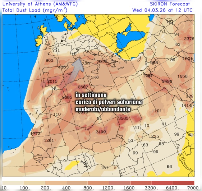 Nel corso della settimana, inoltre, al flusso di correnti meridionali si assocerà anche il trasporto di moderate (a tratti abbondanti) quantità di polveri sahariane, che contribuiranno a rendere i cieli un po’ più lattiginosi.