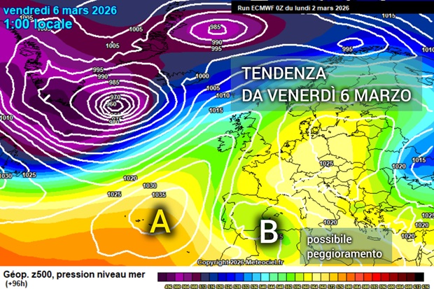 Il promontorio subtropicale infatti risulta parzialmente indebolito, pur continuando ad allungarsi tra l’Italia e l’Europa centro-orientale. La causa è da attribuire all’affondo di una saccatura atlantica tra il Portogallo e il Marocco, dove finirà per isolarsi in una circolazione fredda in quota (la cosiddetta lacuna barica iberico-marocchina) che condiziona il tempo anche dalle nostre parti.