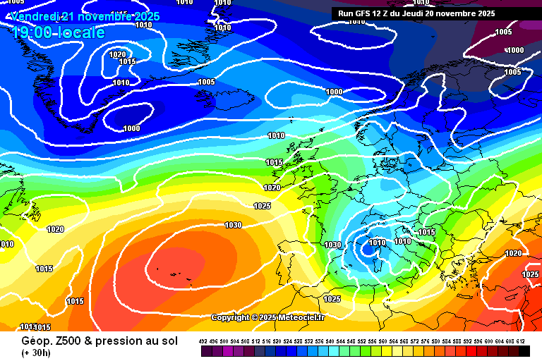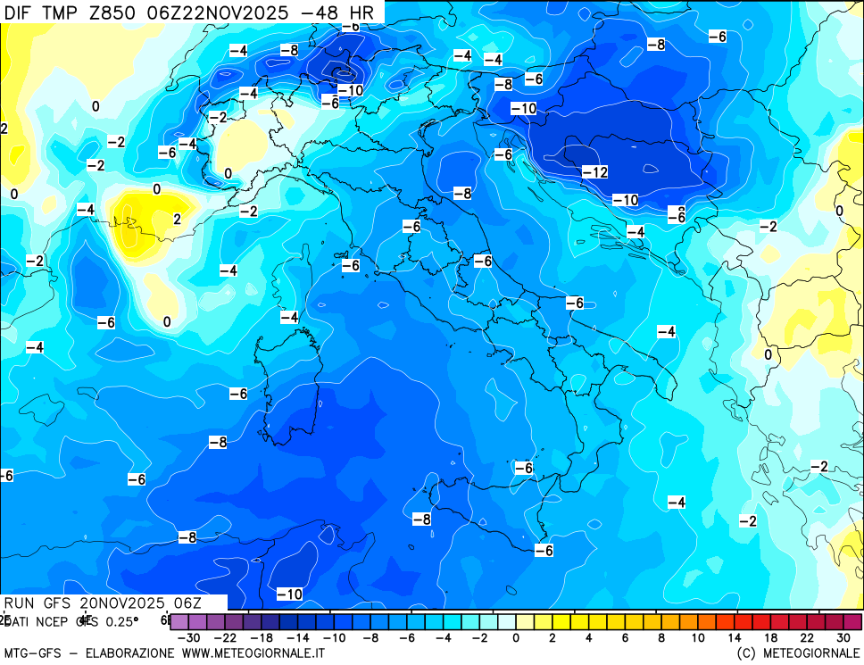 Riversandosi nel Mar Mediterraneo, ancora piuttosto mite, l’aria fredda favorirà la formazione di un minimo depressionario nei pressi del Mar Ligure inizialmente, calamitando il freddo presente sull’Europa centrale anche verso la nostra penisola. Successivamente, nel corso della tarda serata di venerdì, il minimo depressionario principale sopra citato dovrebbe spostarsi verso il Mar Adriatico, mentre un altro minimo dovrebbe formarsi sull’alto Mar Tirreno, scivolando gradualmente verso sud, fino a raggiungere il basso Tirreno entro la serata di sabato 22 Novembre 2025. Ne scaturirà per la nostra isola un’intensa fase di maltempo di stampo invernale, con un vero e proprio crollo termico. Maggiormente favoriti risulteranno I settori centro-occidentali della regione, in quanto l’aria fredda entrerà dalla porta del Rodano, ed il minimo sopra citato sul mar Tirreno favorirà (inizialmente) la risalita di un flusso umido meridionale in questi settori. Il nocciolo freddo in quota a 500 hPa dovrebbe raggiungere la nostra isola con valori fino a circa -30°C nel corso della giornata di sabato, risultando la giornata clou di questa ondata di freddo.