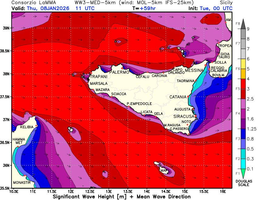 La giornata di mercoledì sarà inoltre caratterizzata dai sostenuti venti occidentali che acuiranno la percezione di freddo, con raffiche forti specie sotto rovesci (fino a 50-70 km/h), giovedì prevalentemente Maestrale ma sempre sostenuto o forte in giornata. Mari che diventeranno entro giovedì agitati sul Canale di Sicilia e il Tirreno, con mareggiate sulle coste esposte.
