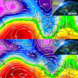 Pausa stabile di breve durata, difatti entro il fine settimana in arrivo il vortice polare tenderà ad abbassarsi notevolmente di latitudine a causa di un possente campo anticiclonico in rinforzo sulla Groenlandia. Aria gelida polare verrà richiamata su buona parte dell’Europa centrale, riuscendo a coinvolgere con minore entità anche il nostro paese. L’unico modello meteorologico che inquadra un affondo più deciso fin verso la Sicilia è Ukmo (Centro Office), mentre tutti i restanti (compreso il centro americano Gfs) vedono una semplice limata, con associata qualche pioggia/nevicata a quote medie. Entro le prossime 48 ore avremo modo di capire se il centro britannico (Ukmo) avrà individuato la giusta via, o se invece sta prendendo un semplice abbaglio. Sicuramente nella visione di Ukmo vi sta un anticiclone atlantico più slanciato, che non consentirebbe pressioni da parte del vortice canadese (affondo polare scivolerebbe senza impedimenti), situazione che avviene nella visione di Gfs.