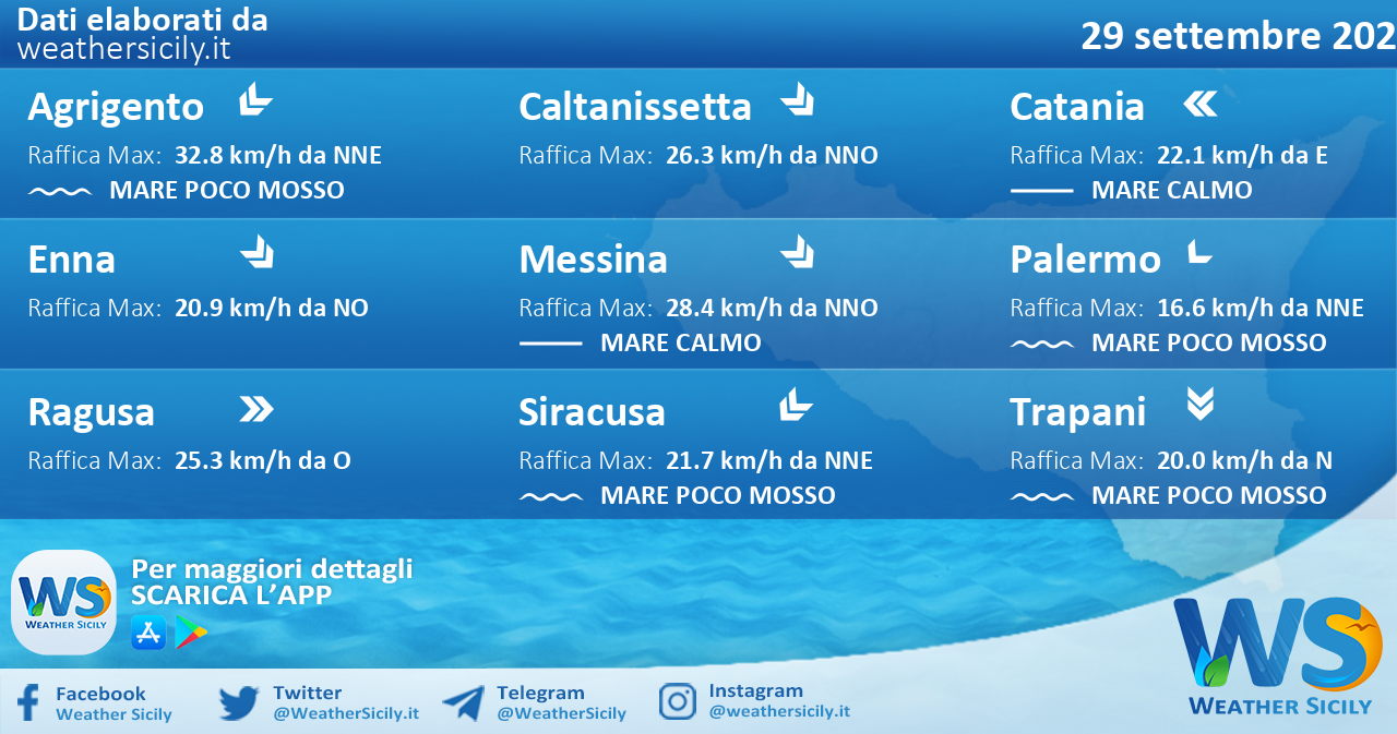 Salve amici di weathersicily.it. Bentrovati nel bollettino giornaliero dedicato ai mari e ai venti. In allegato le condizioni meteo-marine previste per mercoledì 29 settembre 2021 sulle nove città sicule.