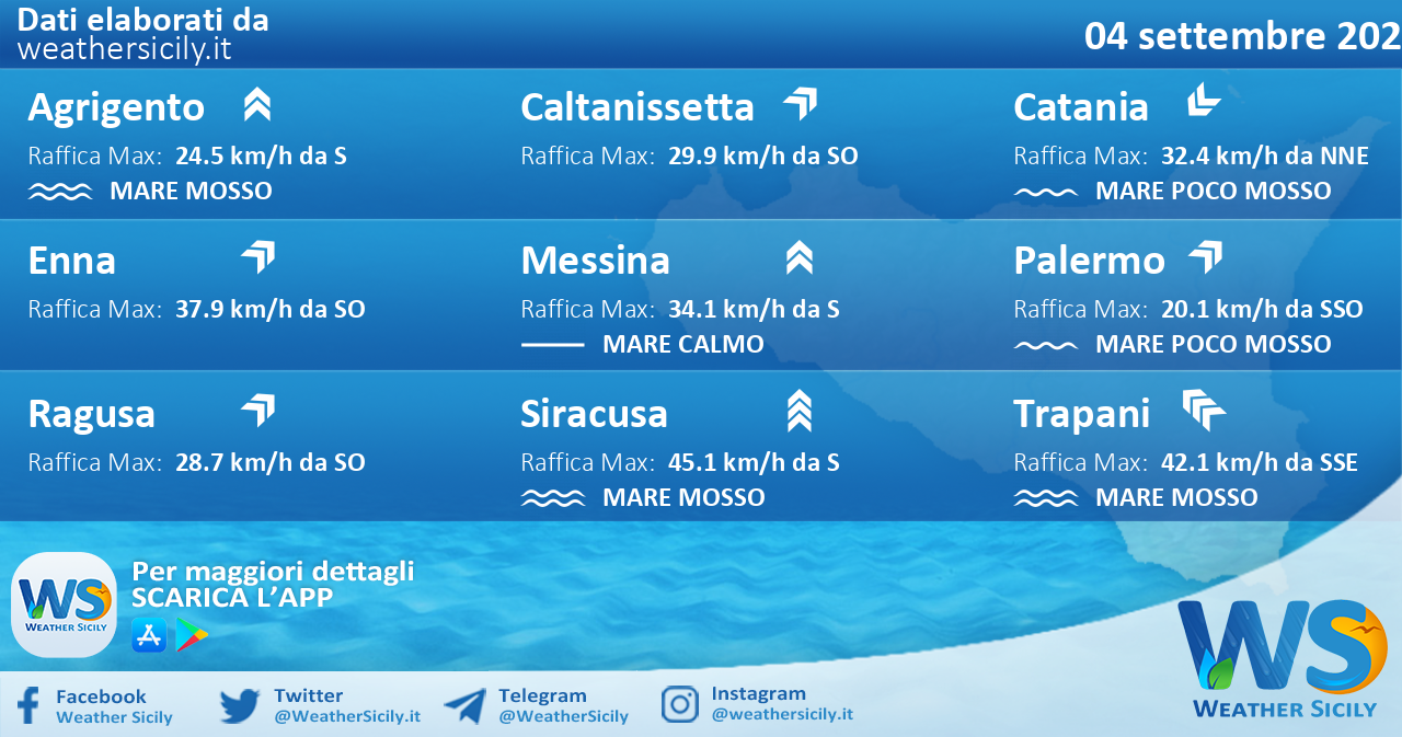 Salve amici di weathersicily.it. Bentrovati nel bollettino giornaliero dedicato ai mari e ai venti. In allegato le condizioni meteo-marine previste per sabato 04 settembre 2021 sulle nove città sicule.