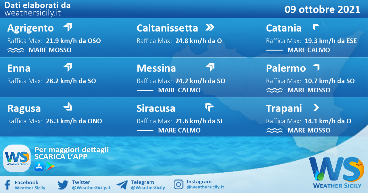 Salve amici di weathersicily.it. Bentrovati nel bollettino giornaliero dedicato ai mari e ai venti. In allegato le condizioni meteo-marine previste per sabato 09 ottobre 2021 sulle nove città sicule.