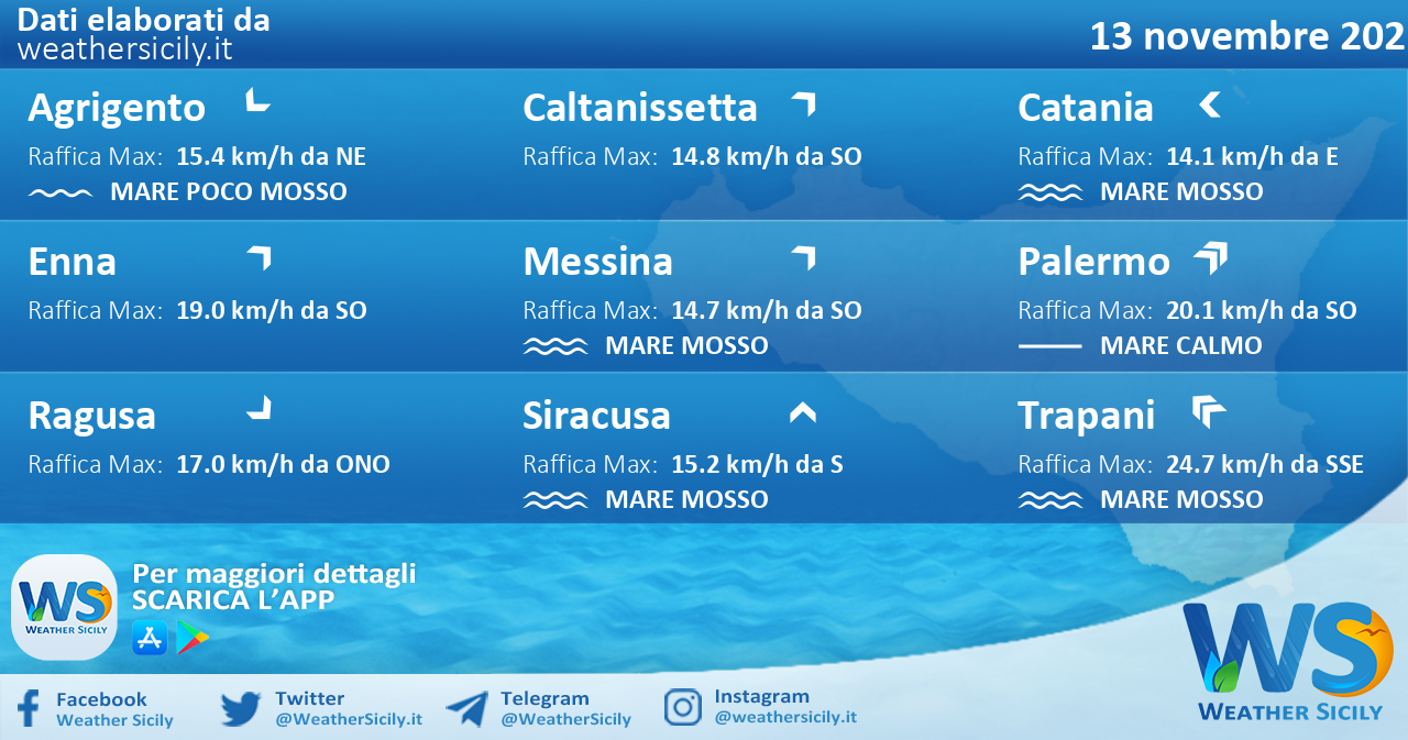 Salve amici di weathersicily.it. Bentrovati nel bollettino giornaliero dedicato ai mari e ai venti. In allegato le condizioni meteo-marine previste per sabato 13 novembre 2021 sulle nove città sicule.