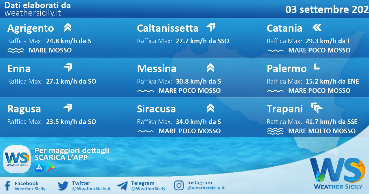 Salve amici di weathersicily.it. Bentrovati nel bollettino giornaliero dedicato ai mari e ai venti. In allegato le condizioni meteo-marine previste per venerdì 03 settembre 2021 sulle nove città sicule.