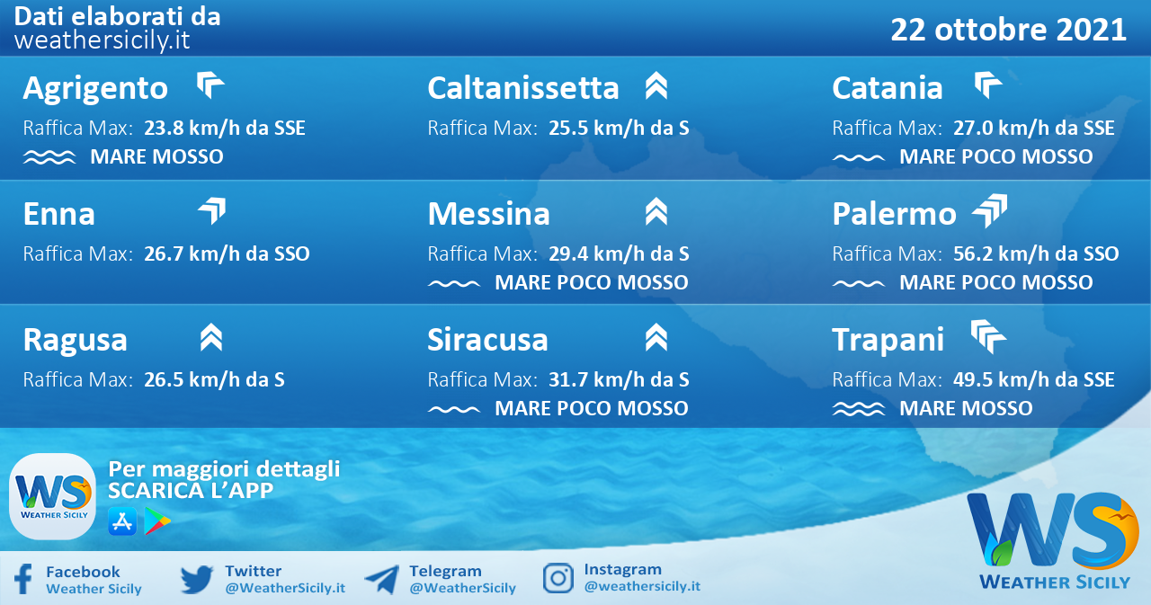Salve amici di weathersicily.it. Bentrovati nel bollettino giornaliero dedicato ai mari e ai venti. In allegato le condizioni meteo-marine previste per venerdì 22 ottobre 2021 sulle nove città sicule.