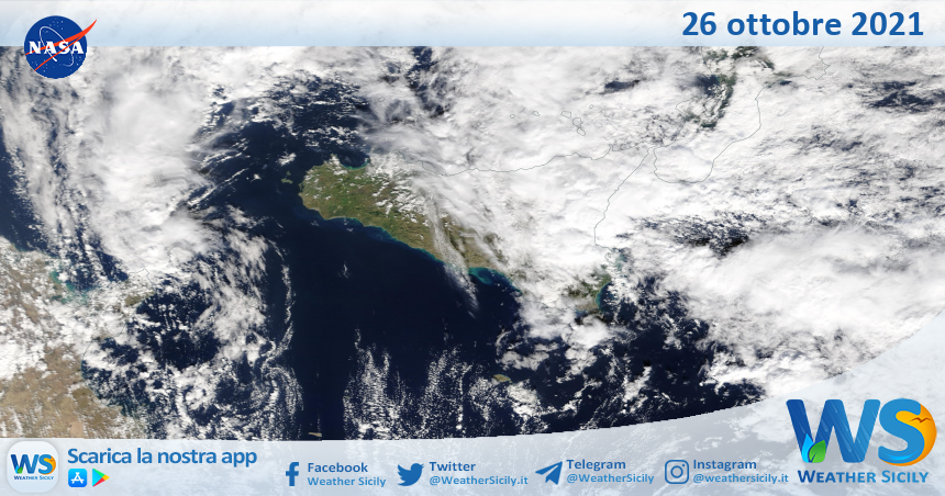 Salve amici di weathersicily.it. Come di consueto vi mostriamo l’immagine satellitare odierna della Nasa, di martedì 26 ottobre 2021, la quale ritrae la nostra isola.
