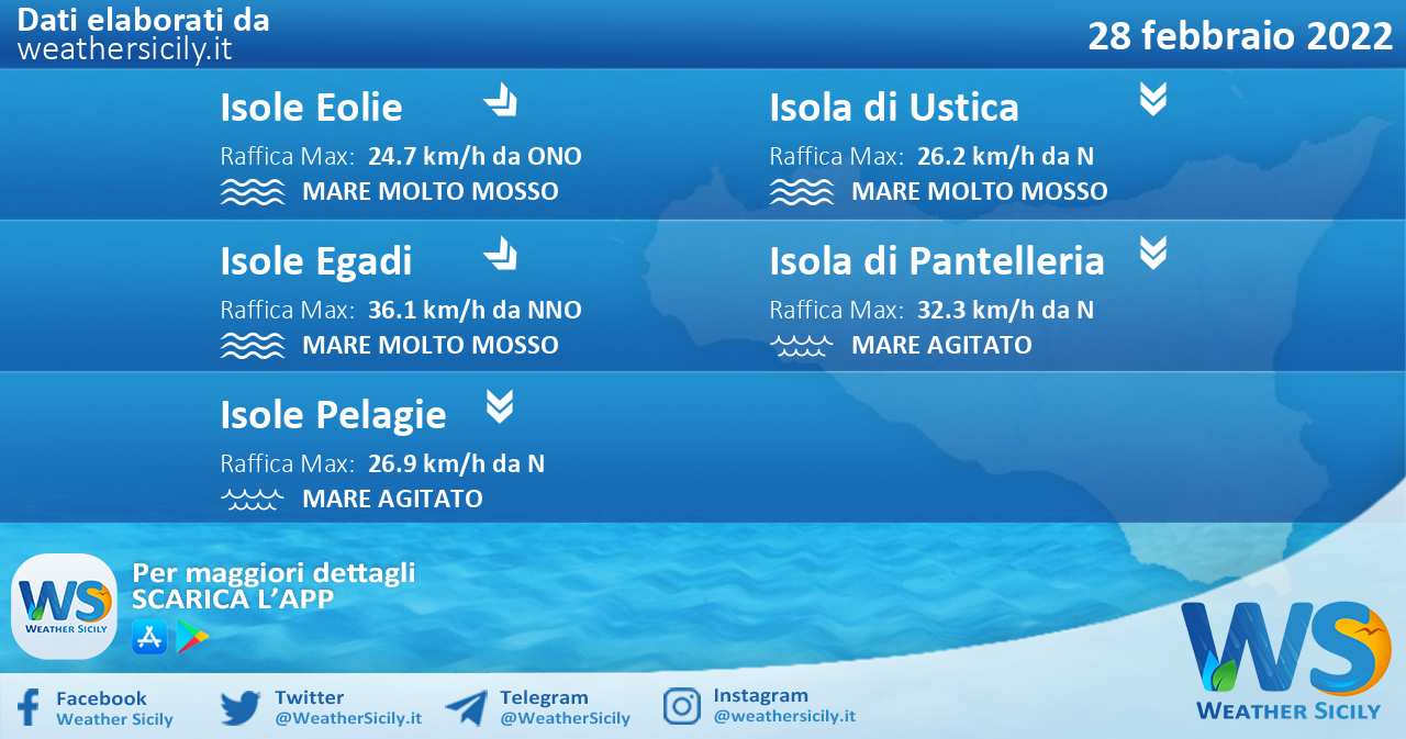 Salve amici di weathersicily.it. Bentrovati nel bollettino giornaliero dedicato ai mari e ai venti. In allegato le condizioni meteo-marine previste per lunedì 28 febbraio 2022 sulle isole minori.