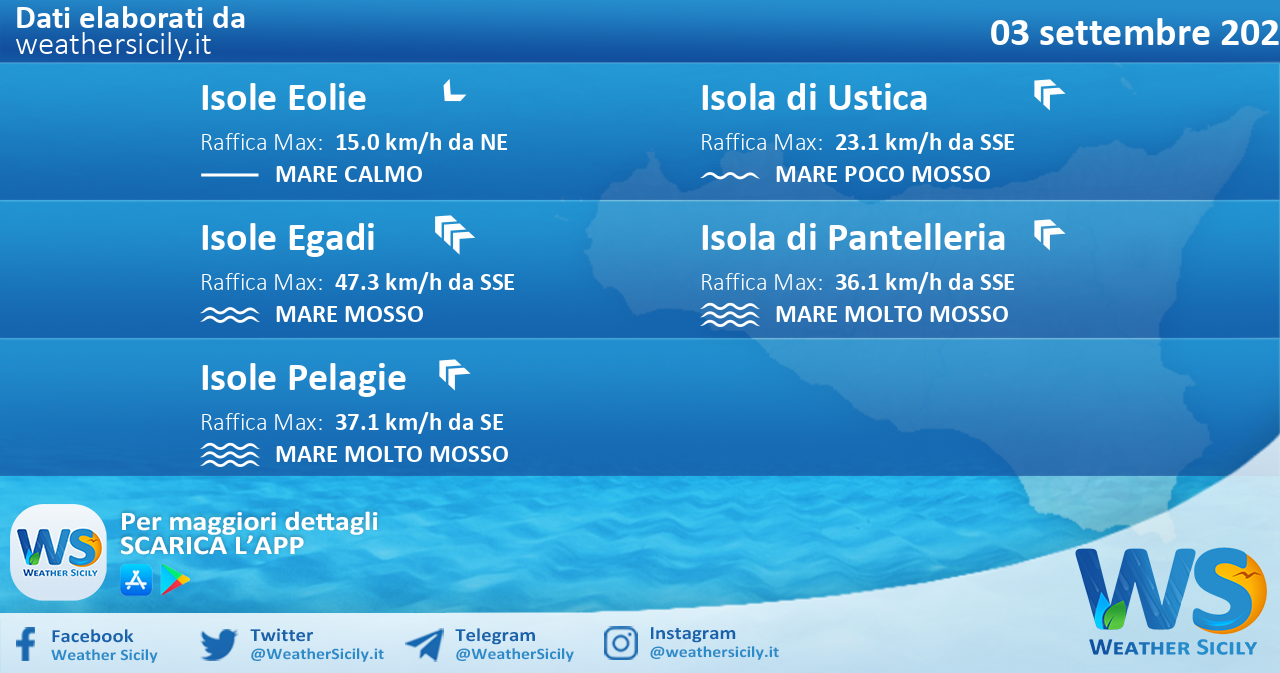 Salve amici di weathersicily.it. Bentrovati nel bollettino giornaliero dedicato ai mari e ai venti. In allegato le condizioni meteo-marine previste per venerdì 03 settembre 2021 sulle isole minori.