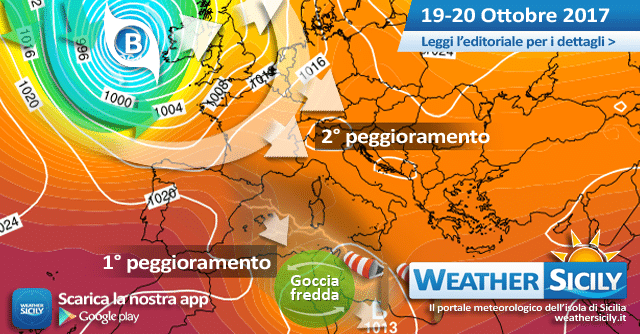 Buonasera amici di weathersicily.it. Possiamo definire ufficialmente conclusa la lunga pausa stabile presente da circa una settimana in Sicilia e su buona parte dell’Europa centrale, essa favorita dalla presenza di un massiccio campo di alta pressione di matrice azzorriana. Come vi avevamo anticipato nel precedente editoriale, entro venerdì 20 ottobre 2017 un impulso atlantico giungerà sul Mediterraneo occidentale, allontanando verso levante il campo anticiclonico in questione. Con lo scorrere delle ore si è assistito ad un allineamento dei modelli riguardante quest’ultima perturbazione , ovvero è finalmente chiaro l’esatto movimento della goccia fredda prossima a generarsi in quota. L’intrusione di essa sul bacino del Mediterraneo è attesa entro domani, mentre durante la giornata di venerdì ritroveremo la goccia atlantica tra Algeria e Tunisia, che alimenterà di conseguenza (a causa della circolazione antioraria) un flusso mite sciroccale verso la nostra isola. Nonostante si tratti di una perturbazione atlantica il posizionamento della struttura depressionaria sul nord Africa modificherà i connotati della stessa in quanto verremo di fatto interessati da correnti sud-orientali/orientali provenienti dal continente sottostante, pertanto l’indice di attendibilità è destinato a portarsi su livelli medi a causa degli elevati indici convettivi previsti sull’area del Canale di Sicilia. Cosa vogliamo dire? Nonostante le precipitazioni attese dovrebbero risultare ridotte e localizzate non escludiamo eventi imprevedibili poichè vige la possibilità di assistere alla formazione di possenti sistemi temporaleschi a mescoscala (MCS) proprio al di sotto dei bacini meridionali, specie durante la serata di venerdì.
