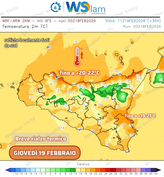Dopo il passaggio burrascoso di inizio settimana, nella nostra regione in queste ore abbiamo avuto un netto miglioramento delle condizioni atmosferiche. Tuttavia, una nuova perturbazione atlantica, associata ad aria più fredda polare marittima, ha raggiunto in queste ore l’Europa nord-occidentale, diretta nel corso delle prossime ore verso l’Europa centrale ed il nord Italia. Da qui, di conseguenza per tali movimenti barici, ne scaturirà per noi un breve ma intenso richiamo mite meridionale, specie nella giornata di domani, giovedì 19 Febbraio 2026.