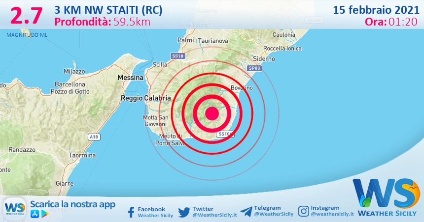 Salve amici di weathersicily.it. Quest’oggi lunedì 15 febbraio 2021 alle ore 01:20 è stata registrata, dalle stazioni sismiche dell’Istituto Nazionale di Geofisica e Vulcanologia, una scossa di magnitudo 2.7 ad una profondita di 59.5 km.