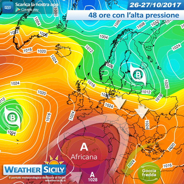 Come vi avevamo già anticipato nell’ultimo editoriale, a partire da giovedì 26 ottobre 2017 l’alta pressione africana (soffermatosi in questi ultimi giorni sull’Europa occidentale) tenderà a slanciarsi qualche km verso levante, interessando anche l’area centrale del Mediterraneo. Tuttavia la nostra regione sarà soltanto sfiorata da tale campo anticiclonico, che interessa principalmente la penisola iberica ove ritroviamo isoterme superiori ai +15°C alla quota di 1.500 m circa. In Sicilia durante la giornata di giovedì continueranno a scorrere lievi infiltrazioni nord-orientali grazie al posizionamento della goccia fredda artica sull’alta Libia nord-orientale. Soltanto venerdì 27 qualche isoterma più mite tenderà ad avvicinarsi, apportando valori massimi intorno ai +24/+25°C lungo le zone costiere.