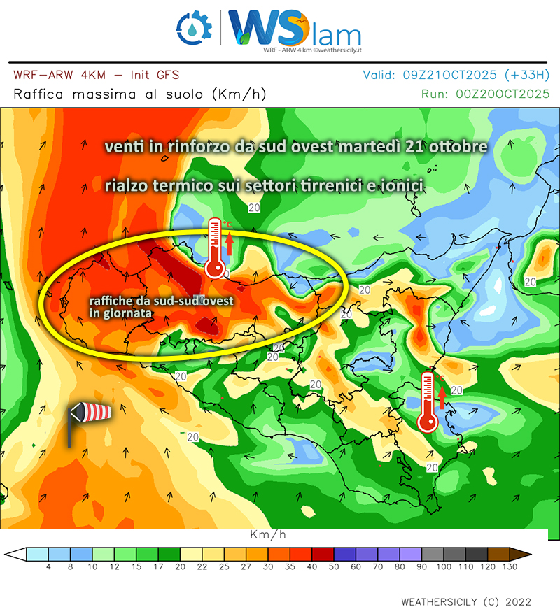 La giornata di domani sarà caratterizzata da un temporaneo rinforzo dei venti dai quadranti sud-occidentali, in particolare sul trapanese e sui versanti tirrenici (legate all’avvicinamento di una debole perturbazione verso il centro sud), con raffiche in mattina anche fino a 40-60 km/h sulle zone esposte.