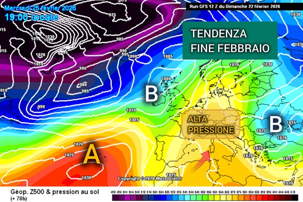 Come già annunciato, la parte finale del mese – con cui si chiuderà (il 28 febbraio) anche l’inverno meteorologico – vedrà una pausa atmosferica, dettata da un’ampia espansione del promontorio subtropicale sul Mediterraneo e buona parte d’Europa che terrà lontano il flusso perturbato atlantico. Non mancheranno in realtà dei movimenti a livello europeo: infatti a metà settimana una saccatura riuscirà ad affondare sulla penisola iberica, mentre una massa d’aria fredda si spingerà sulla parte orientale del continente.
