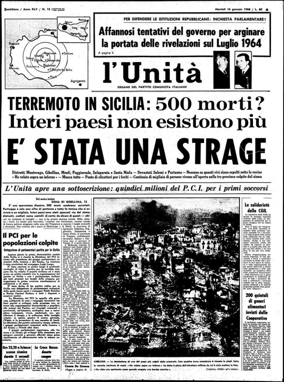 53 anni fa, 14 gennaio 1968, sono le 13:28, una prima scossa. Gravi danni a Montevago, Gibellina, Poggioreale e Salaparuta. Panico, gente in strada. Qualche ora dopo, un’altra, più forte, sentita fino a Palermo e Trapani. Il peggio sembra passato, è notte. Avviene l’insperabile, una fortissima scossa di M6.4 che, alle 3:01 della notte tra il 14 e il 15 gennaio, causò gli effetti più gravi. Danni ingenti a Gibellina, Montevago, Santa Maria del Belice, Salemi e Partanna. Più di 400 morti, migliaia di feriti e 60.000 sfollati.